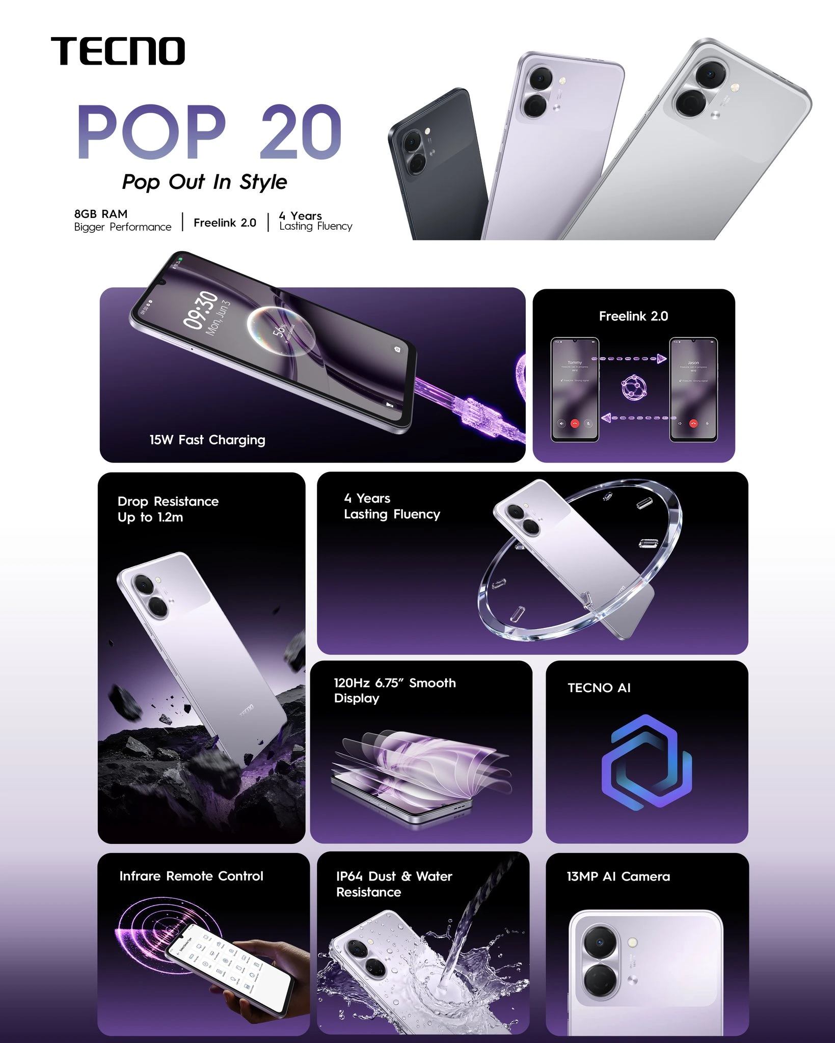 | In the Box | Tecno Pop 20 Handset Quick Start Guide USB Type-C Cable Charger Sim Ejecting Tool Warranty Card |