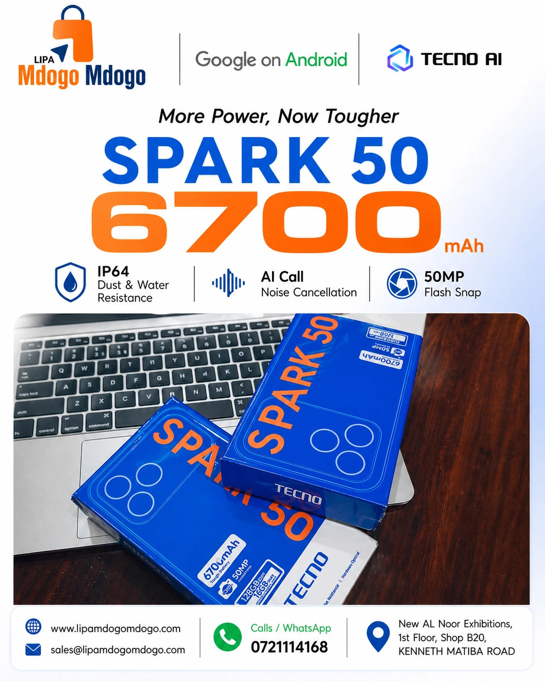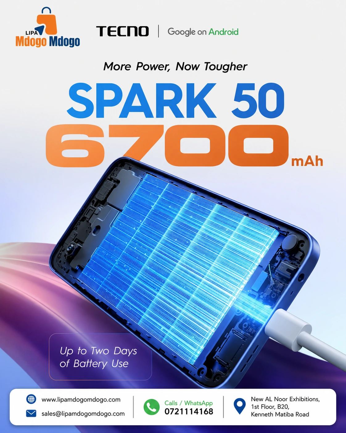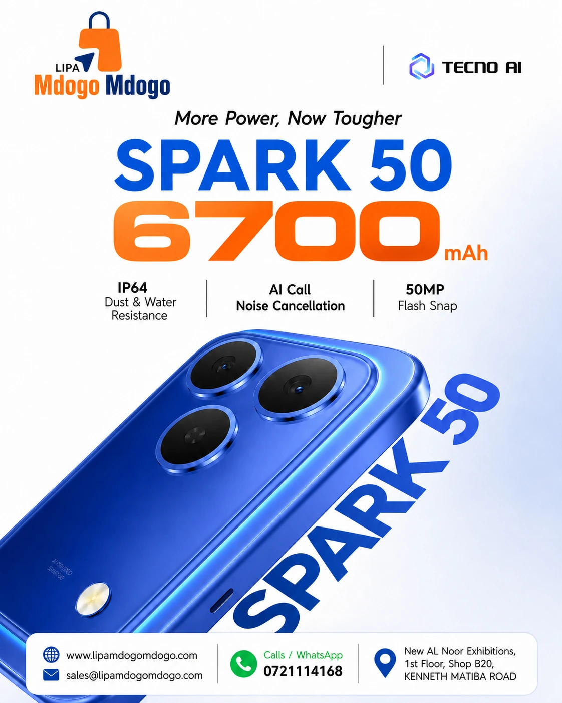 Tecno Spark 50 (128GB/4GB) is available on lipa mdogo mdogo at a deposit of Ksh 3,500; followed by installments of Ksh 85 Daily for one year.